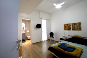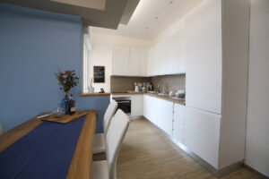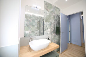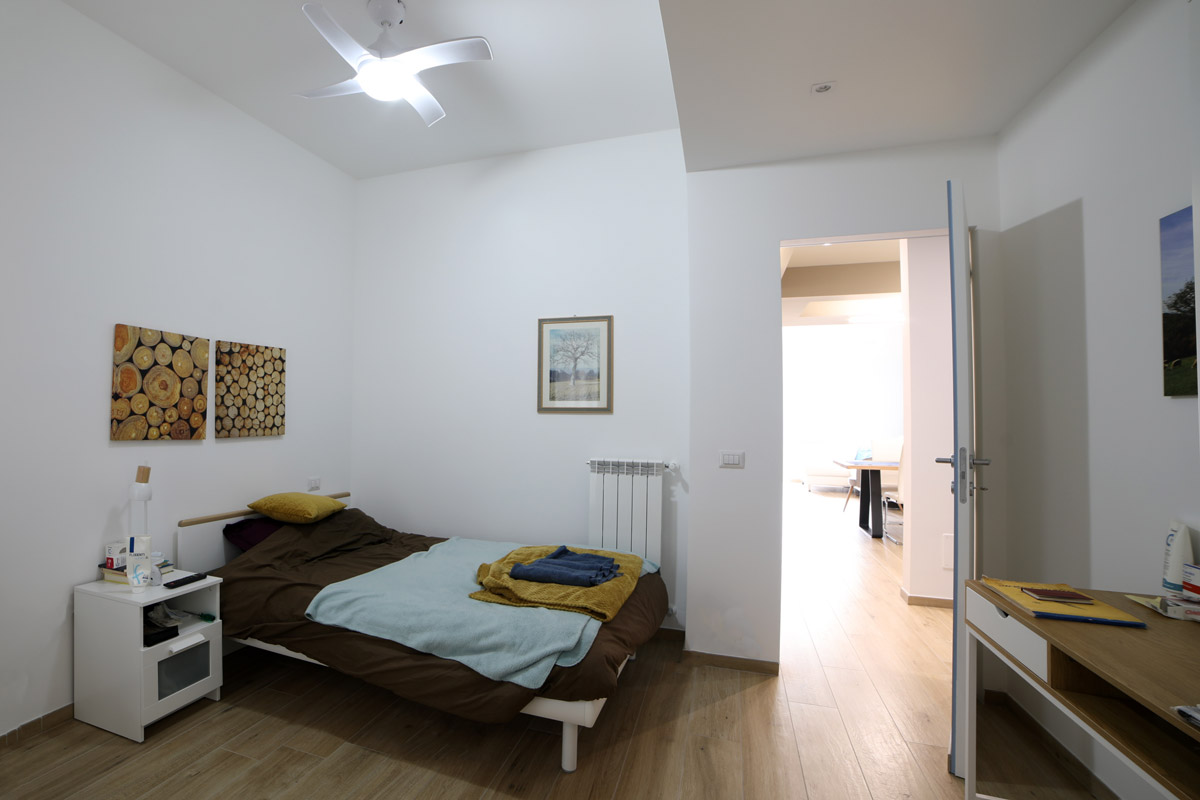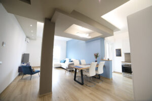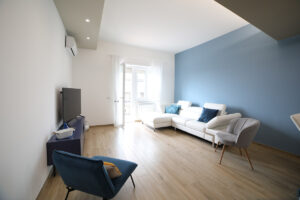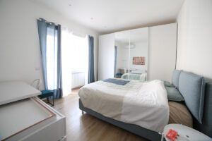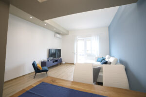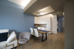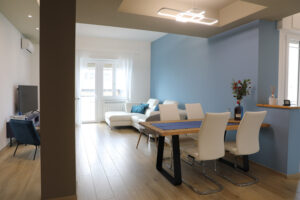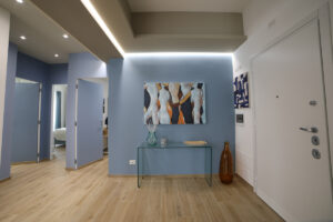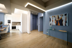 Il pavimento in gres effetto legno è diventato sempre più popolare in quanto offre un’alternativa durevole ed elegante al legno vero e proprio. Nel nostro progetto, abbiamo utilizzato questo materiale per creare un’atmosfera calda e accogliente, che si sposa perfettamente con l’arredamento moderno delle due camere da letto e del soggiorno living.