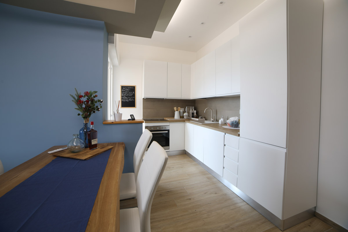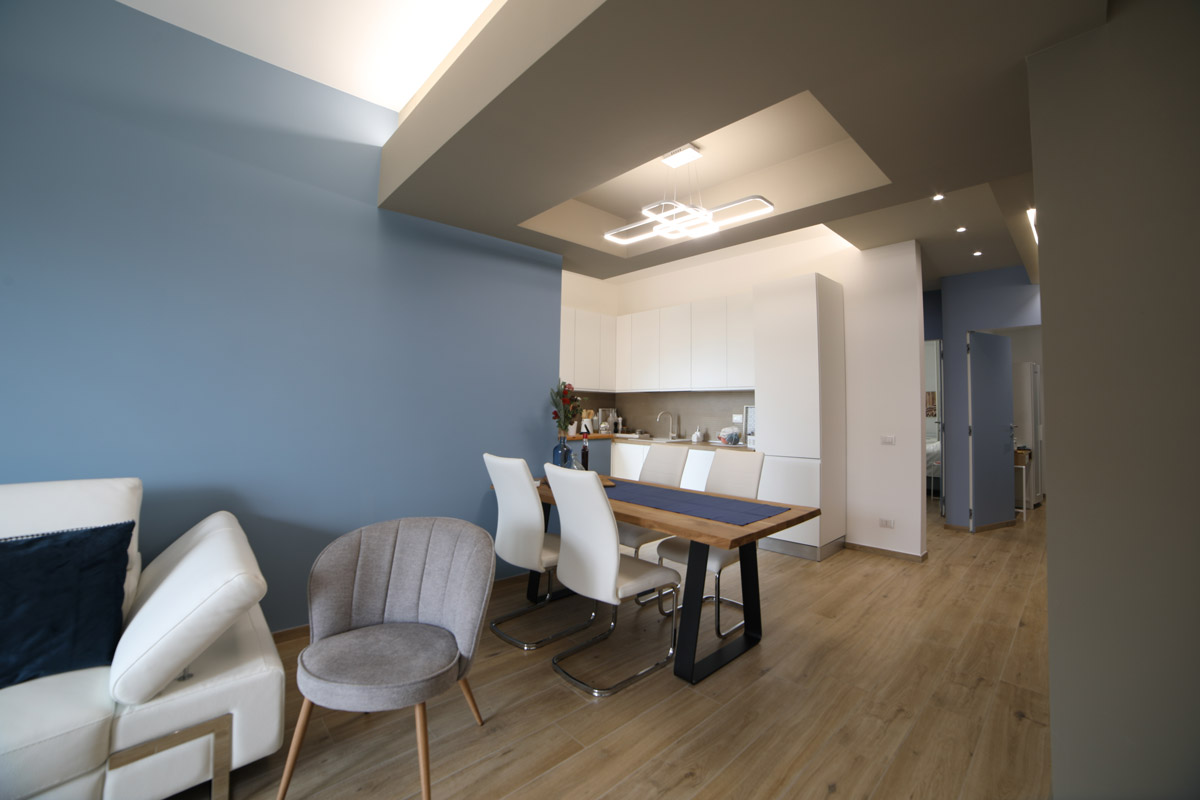 Per aggiungere un tocco di colore il cliente ha scelto “carta da zucchero” come colore predominante. Questo ha creato un contrasto vibrante con il pavimento in gres effetto legno, dando vita ad uno stile moderno e raffinato.